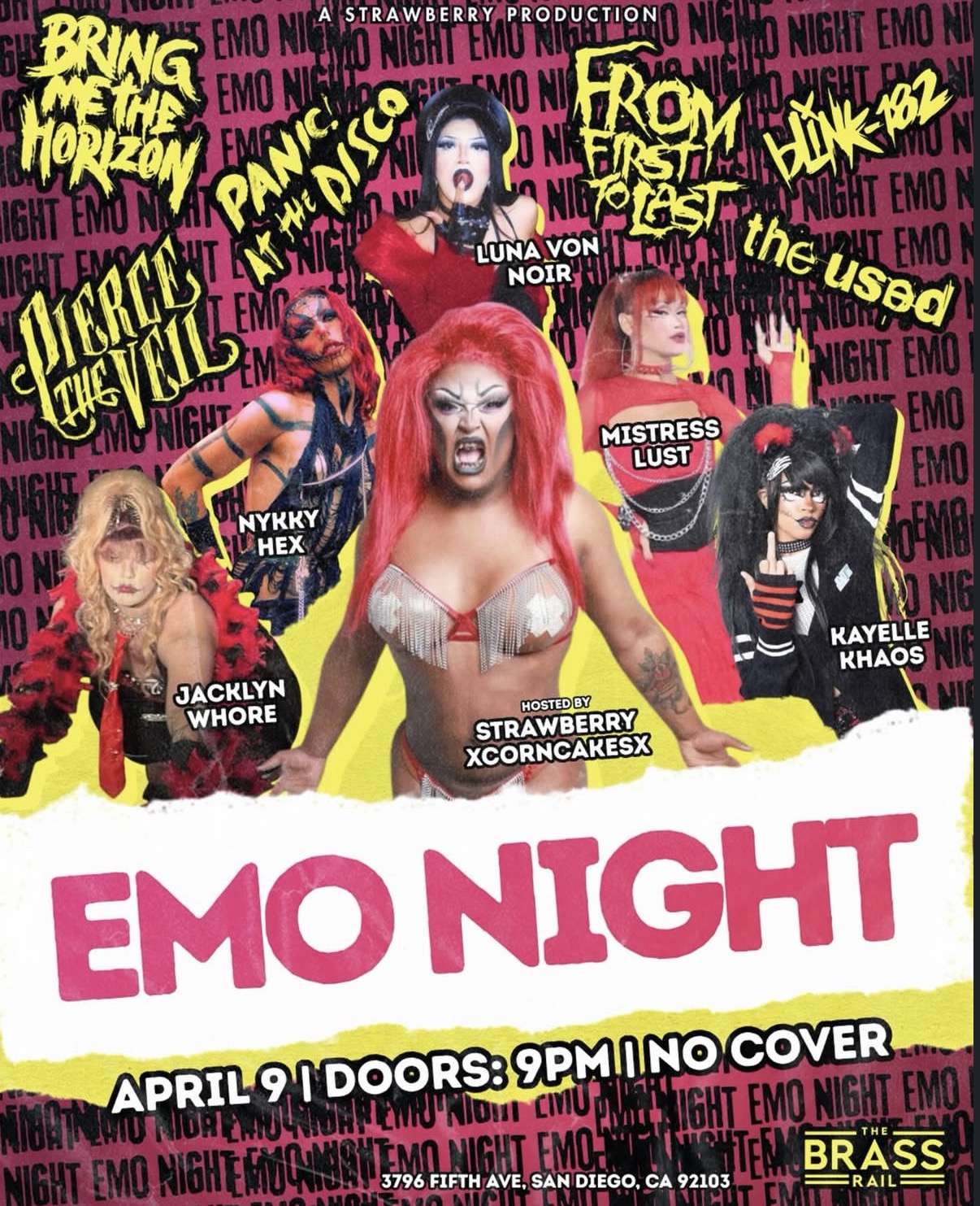 Get ready for a night of nostalgia, angst, and high-energy drag as Emo Night takes over The Brass Rail on Thursday, April 9. Featuring performances inspired by iconic emo and pop-punk artists like Bring Me The Horizon, Panic! At The Disco, Pierce The Veil, From First To Last, Blink-182, and The Used, this show blends alternative music culture with drag performance.