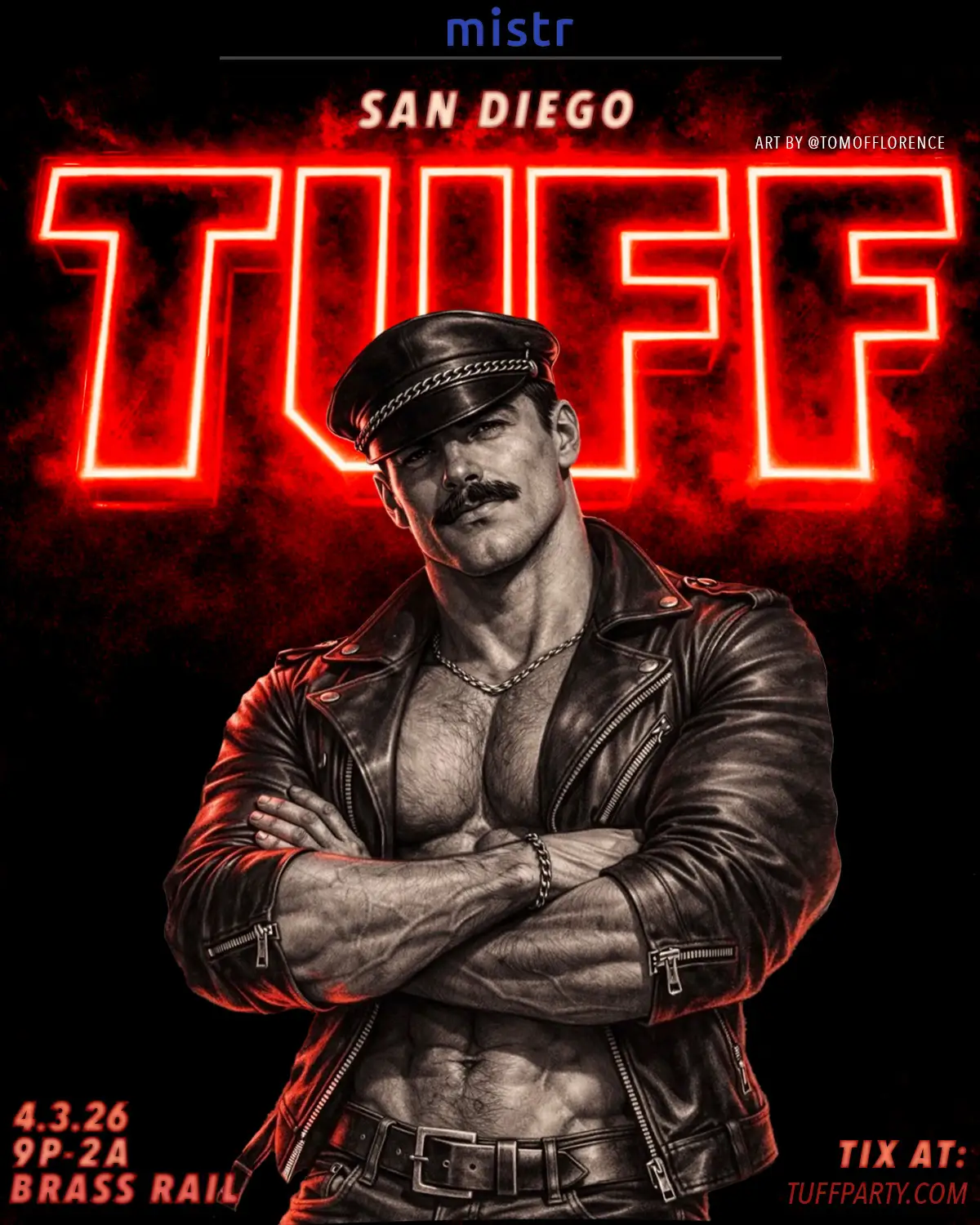 TUFF returns to The Brass Rail for a high-energy nightlife experience celebrating confidence, masculinity, and self-expression rooted in San Diego’s leather and fetish nightlife culture. Known for its signature red-lit atmosphere, heavy beats, and gear-forward crowd, TUFF creates a space where bold looks and unapologetic presence take center stage.